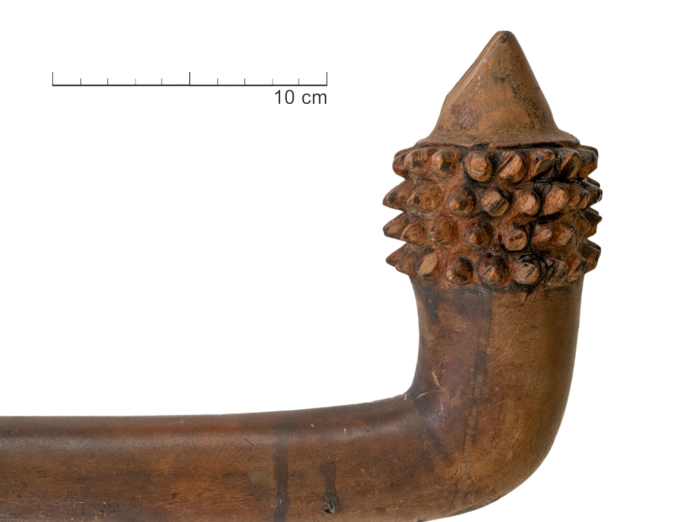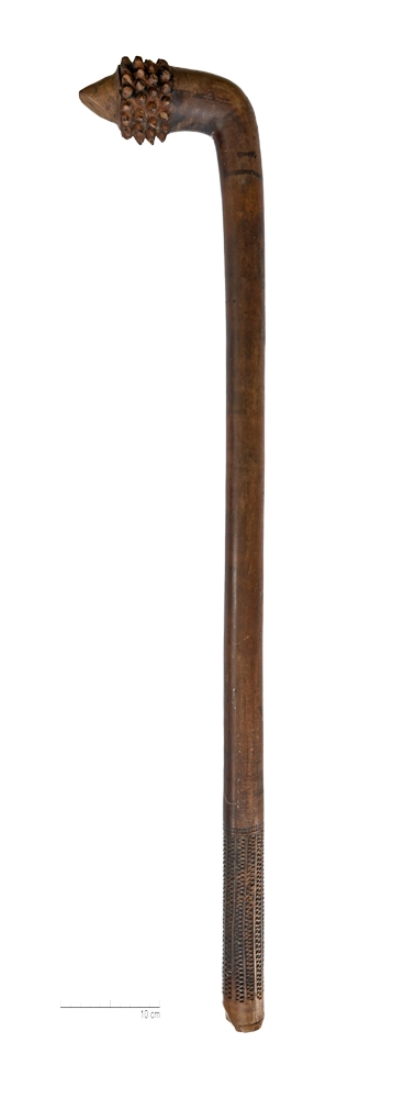 Las armas polinésicas fueron objetos intercambiados por los navegantes occidentales como trofeos de sus expediciones, y pronto atrajeron el interés de los coleccionistas europeos. Este ejemplar tiene un mango largo y cilíndrico encorvado hacia una punta, en la que fueron talladas púas en disposición esférica y un pico cónico en el extremo distal. Los motivos geométricos de la empuñadura permiten asirlo con firmeza, mientras que los elementos punzantes de la cabeza facilitan la fractura del cráneo del oponente.